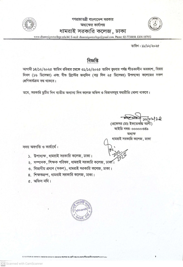 Notice Title : শ্রেণিকার্যক্রম বন্ধের বিজ্ঞপ্তি