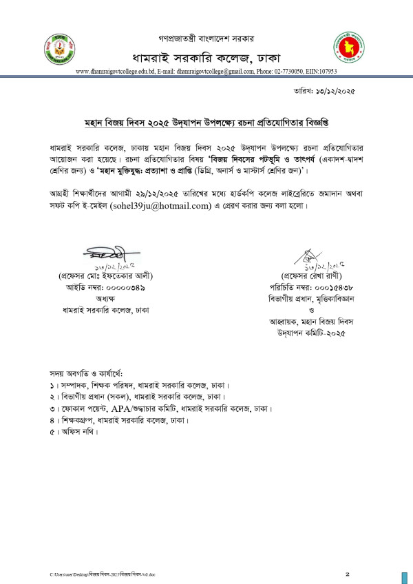Notice Title : মহান বিজয় দিবস উদযাপন - ২০২৫ উপলক্ষ্যে রচনা প্রতিযোগিতার বিজ্ঞপ্তি