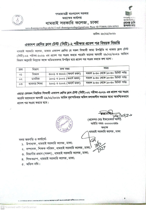 Notice Title : একাদশ শ্রেণির সিটি-০২ পরীক্ষার প্রবেশ পত্র বিষয়ক বিজ্ঞপ্তি