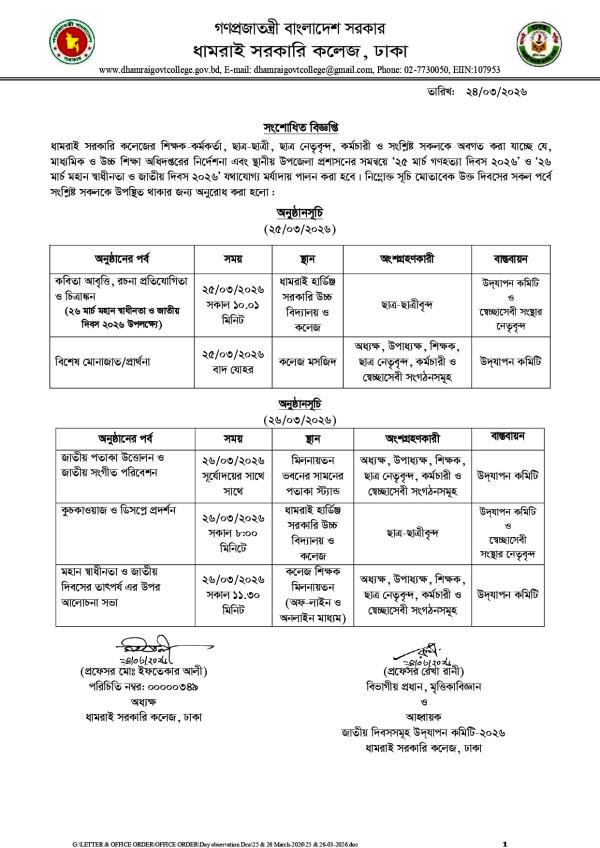 Notice Title : ২৫ মার্চ গণহত্যা দিবস ২০২৬ ও ২৬ মার্চ মহান স্বাধীনতা ও জাতীয় দিবস ২০২৬ এর সংশোধিত বিজ্ঞপ্তি