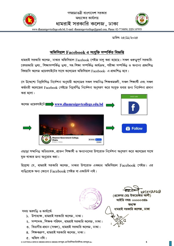 Notice Title : ধামরাই সরকারি কলেজ, ঢাকার অফিসিয়াল ফেসবুকের সাথে যুক্ত থাকা প্রসঙ্গে