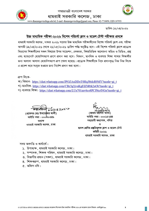 Notice Title : উচ্চ মাধ্যমিক পরীক্ষা-২০২৬ বিশেষ পরিচর্যা ক্লাস ও মডেল টেস্ট পরীক্ষা