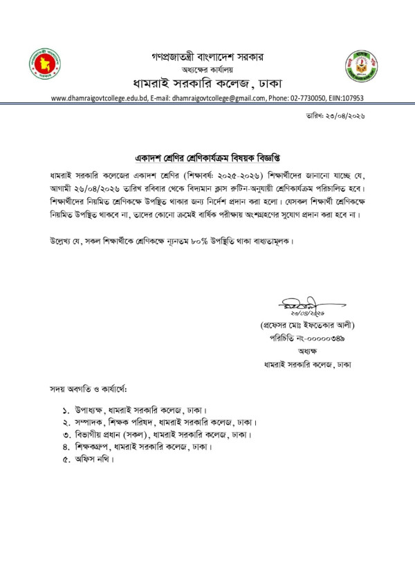 Notice Title : একাদশ শ্রেণির শ্রেণিকার্যক্রম বিষয়ক বিজ্ঞপ্তি