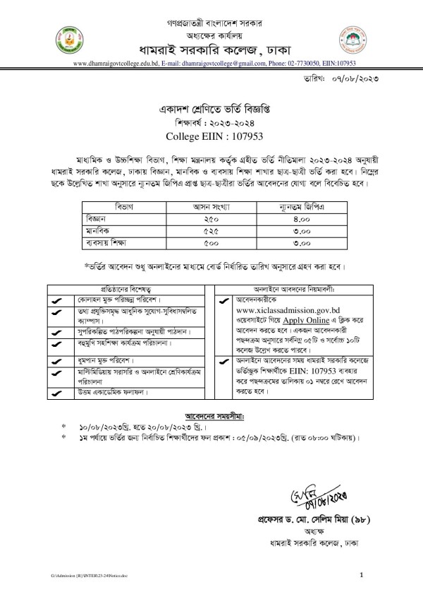 Notice Title : একাদশ শ্রেণিতে ভর্তির বিজ্ঞপ্তি শিক্ষাবর্ষ: ২০২৩-২০২৪